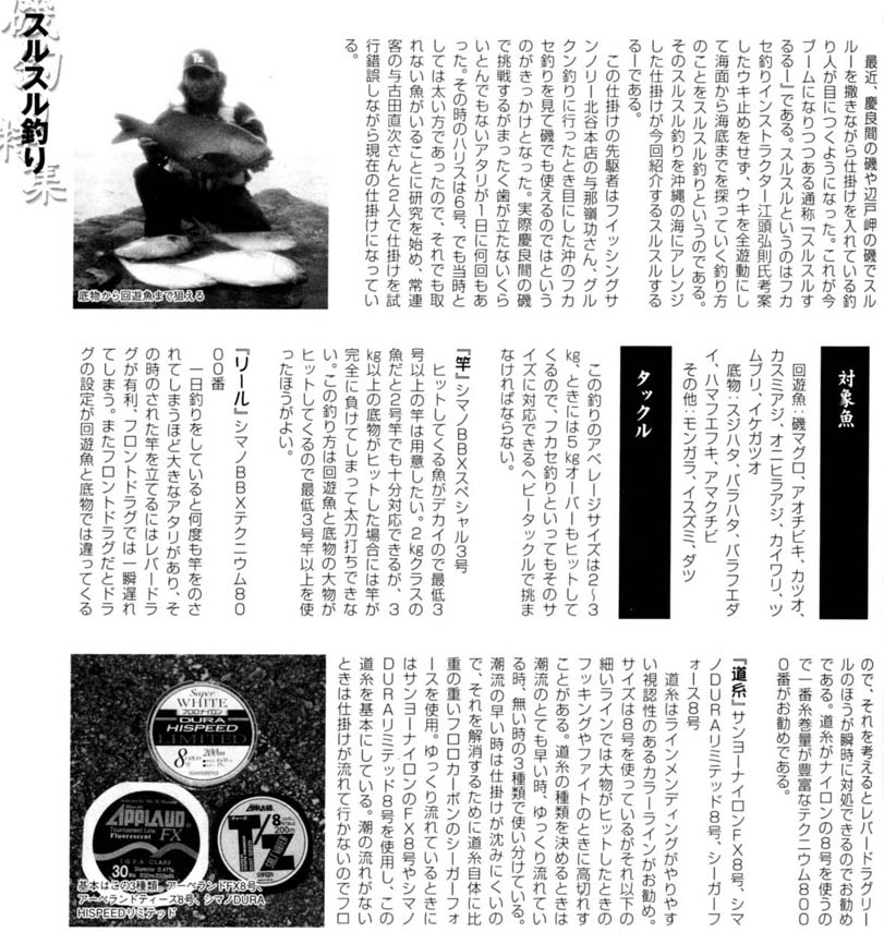 慶良間の磯や辺戸岬周辺の磯での全遊動フカセ仕掛け、通称『するするスルルー』釣り。先駆者は与那嶺功さん(ダイワモニター、サンノリーオリジナルウキBig-oneを開発)と与古田直次さん(がま磯慶良間スペシャルのモニターとして関わった)。
