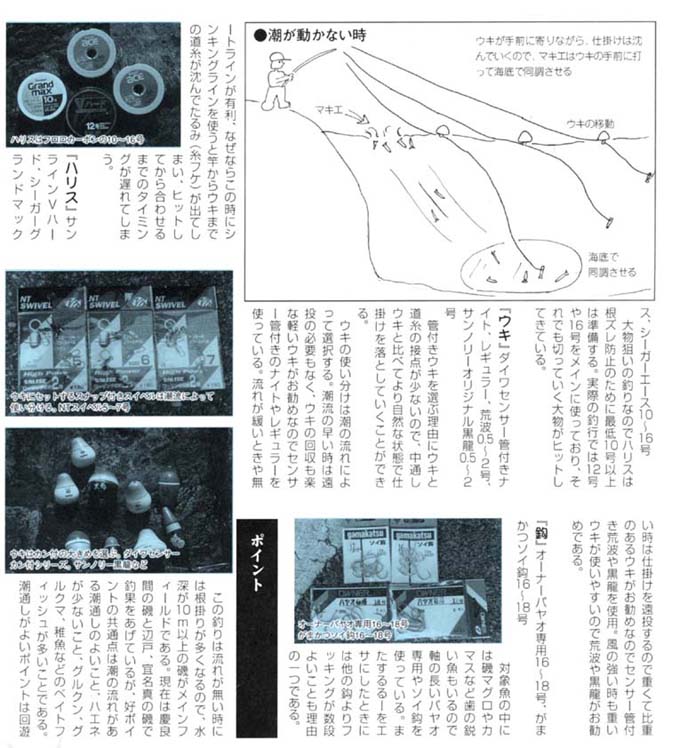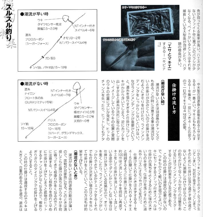 沖釣りのフカセ釣りをヒントに、この釣り方を試行錯誤の末、釣果をあげるようになった。今までのフカセ釣りと違うのは、エサはオキアミではなくキビナゴ(方言名:スルルー)をエサにして、マキエにも集魚剤やオキアミを使わずにスルルーだけを撒くのである。