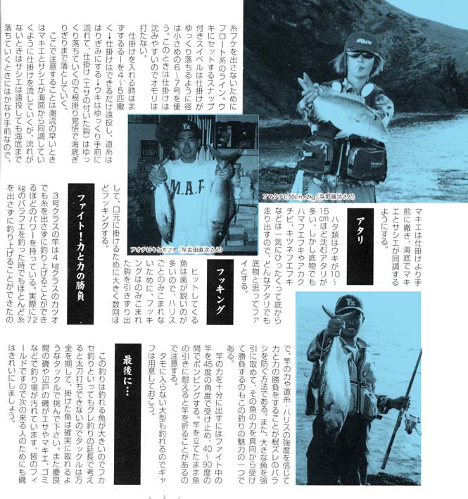 釣れる魚は、カツオ、アオチビキ、イソマグロ、カスミアジ、オニヒラアジ、ツムブリなどが多く、その他、フエフキ類、スジハタ、バラハタ、バラフエ、モンガラなどである。